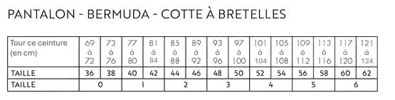 - Caractéristiques techniques : Tailles : du 36 au 60