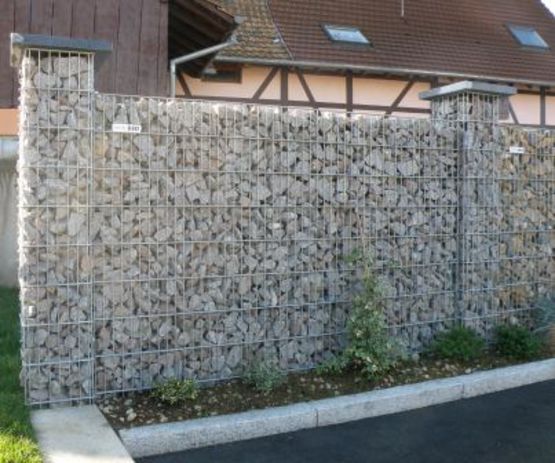 Ce mur de clôture est réalisé en gabions constitués d'une structure en double fil d'acier galvanisé de 6/8/8 mm de diamètre formant un maillage de 50 mm de largeur et 200 mm de hauteur. Les faces avant et arrière sont solidarisées via des écarteurs de 5 mm de diamètre. Il est proposé en 9 hauteurs de 60 à 240 cm pour une épaisseur minimum de 25 cm. Remplissage par pierres concassées de granulométrie 60/120 mm.