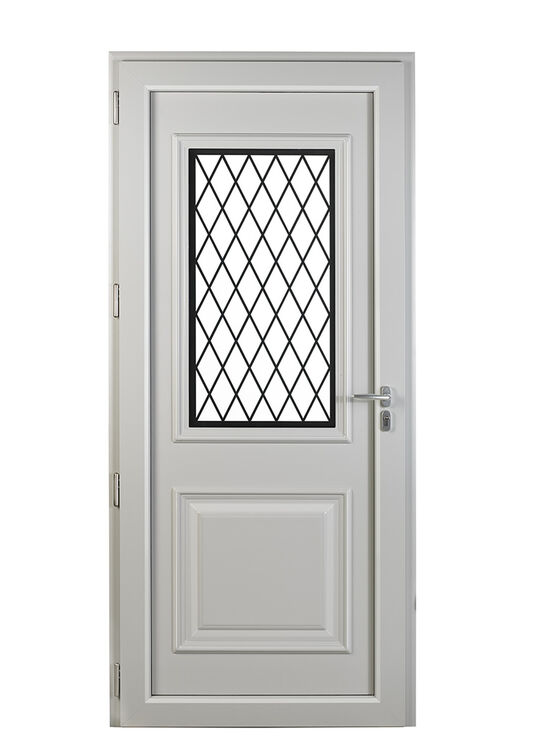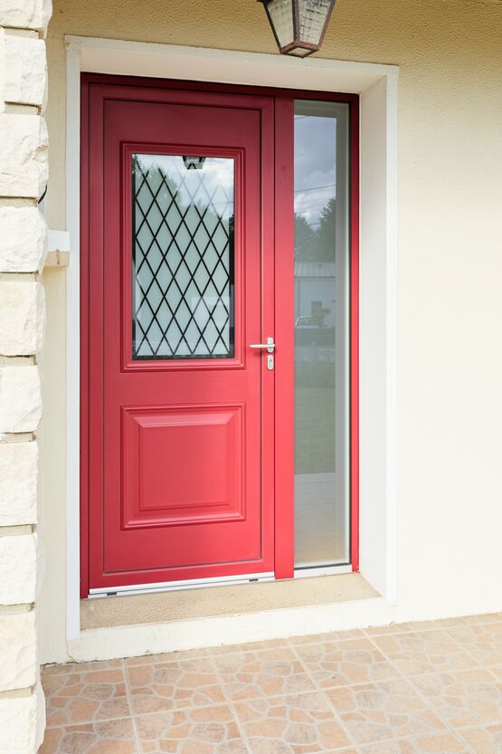 La porte d'entrée en aluminium Bayon propose un style traditionnel grâce à ses cadres moulurés et ses vitrages décoratifs, qui apportent lumière et charme à l'entrée de la maison.