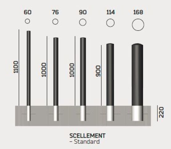 Disponibles en 5 diamètres : 60 mm, 76 mm, 90 mm, 114 mm et 168 mm, les potelets simples P0 76 peuvent être décorés par une tête bombée standard ou en tête plate, proposée en option gratuitement. Ils sont : à sceller, amovibles ou sur platines à cheviller.