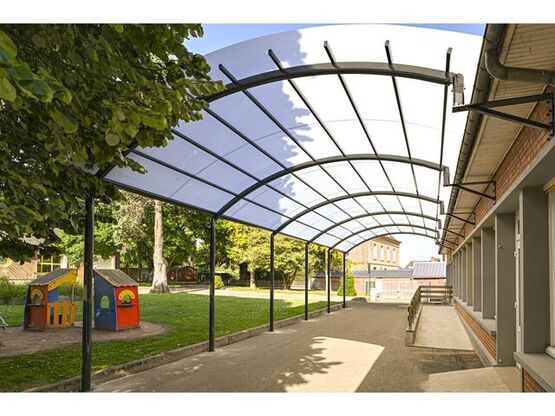 Leur couverture en polycarbonate massif traité UV 2 faces protège efficacement contre les rayons de soleil et permet la protection de la voie de circulation des personnes à mobilité réduite. Ils garantissent une bonne luminosité et n'assombrissent pas les classes en proximité directe.