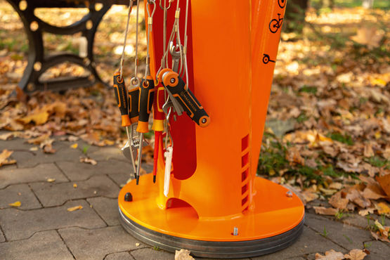 Cet équipement urbain est composé d'un tube de protection pompe à pied, des outils sont fixés par des câbles acier et d'une embase en tôle d'acier. Le cycliste peut suspendre son vélo ce qui facilite la réparation et l'entretien.