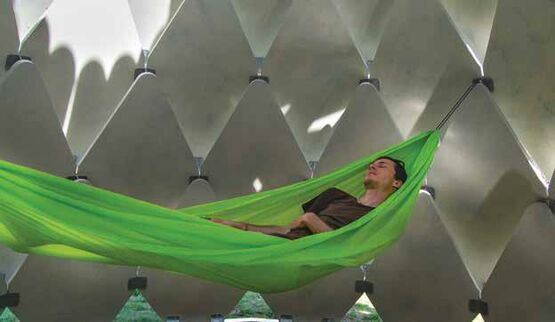 Le dôme du pavillon, en forme de pomme de pin, est autoportant et composé de 109 lattes disposées en plusieurs rangées. La disposition des lamelles donne une impression d'espace et d'aération tout en offrant un microclimat confortable et une acoustique parfaite.