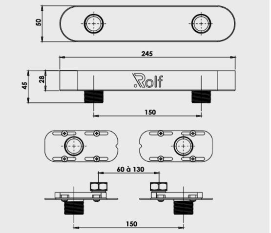 ROLF Ax’o permet de raccorder tous les mélangeurs, mitigeurs mécaniques ou thermostatiques d’entraxe standard 150 mm aux arrivées d’eau existantes allant de 55 mm à 130 mm d’entraxe.