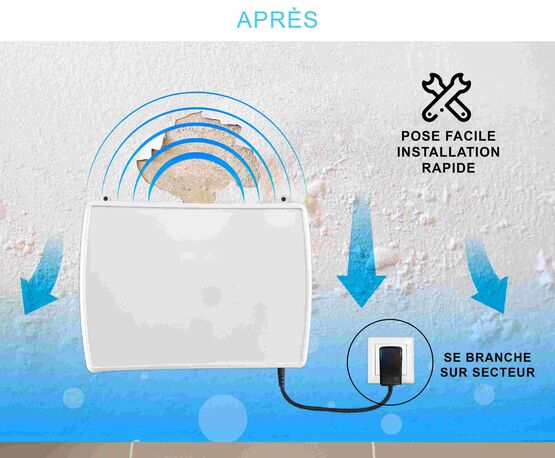 Le boîtier émet dans le mur de faibles impulsions électriques vers le sol. Cela inverse la polarité des champs électromagnétiques déjà présents dans le mur et chasse l’eau vers le sol.