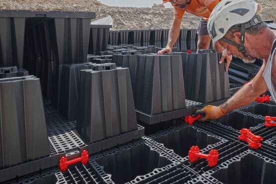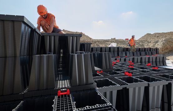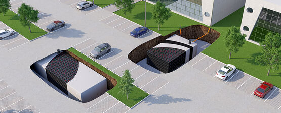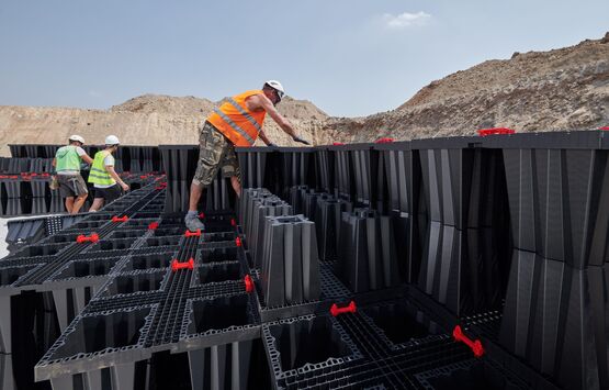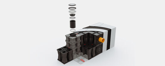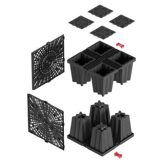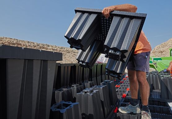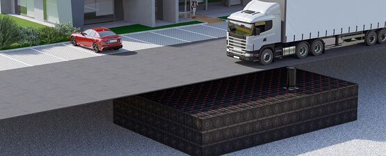 L'espace de stockage est créé par une multitude d'éléments Aquabox qui peuvent être combinés pour former des plantes de toutes tailles. L’avantage de cette méthode est qu’avec ce système d’infiltration, le volume de la cavité est jusqu’à 3 fois supérieur à celui d’une tranchée de gravier, ce qui permet de protéger l’espace et l’excavation.