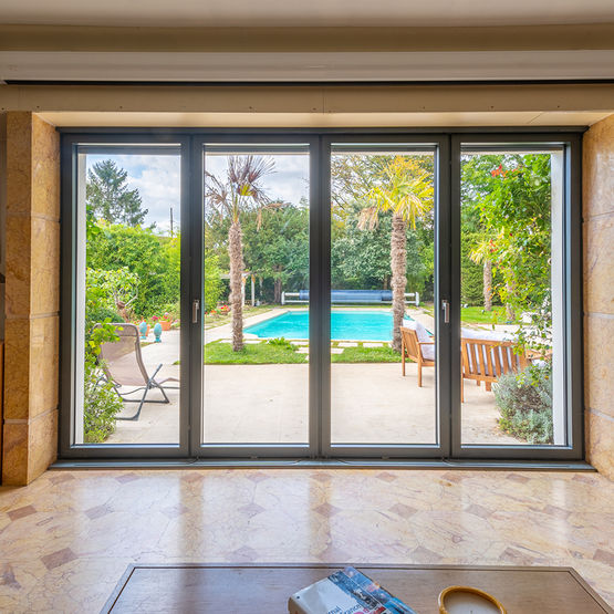 - Disponible en 1, 2 ou 4 vantaux (dont 2 fixes), à double ou triple vitrage