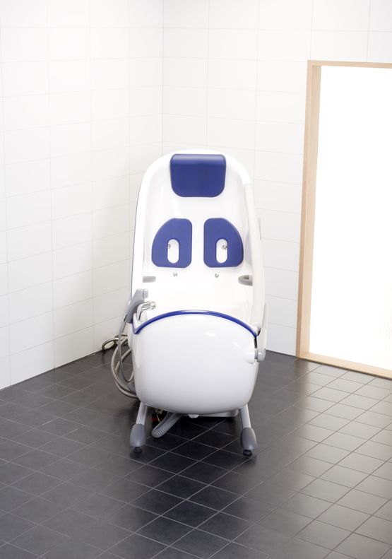 Baignoire avec porte latérale, à hauteur et inclinaison variables électriques (basse tension 24 V) facilitant l'accès au bain des personnes à mobilité réduite et améliorant la position de travail du personnel soignant.