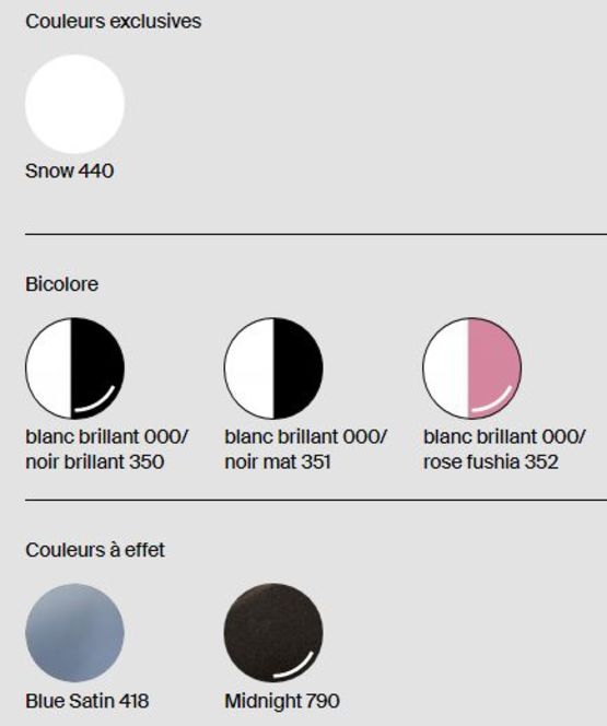 | Couleur : | blanc ; gris ; noir - 056 ; Pergamon 001, Manhattan 002, Bahama beige 003, Edelweiss 004, Snow 440, blanc brillant 000/ rose fushia 352, etc |