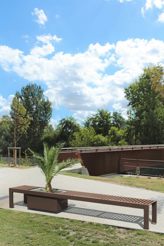 Banquette + Jardinière Synergie : longueur 3 000 mm, profondeur 520 mm, hauteur assise 420 mm. Bac jardinière : 670 x 410, profondeur 320 mm