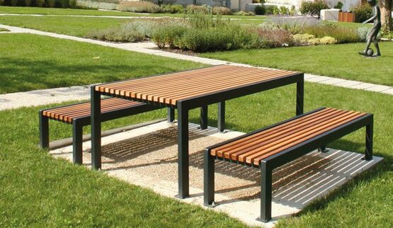 Elle est constituée de bancs, banquettes, fauteuils, tables et transats, conçus en acier thermolaqué et lattes de bois de petites sections.