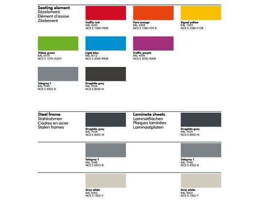 Cette gamme de mobiliers résistants et durables se distingue par un vaste choix de coloris attribués à l’assise : rouge signalisation RAL 3020, pourpre signalisation RAL 4006, jaune de sécurité RAL 1003, vert jaune RAL 6018, bleu clair RAL 5012, orangé pur, RAL 2004, gris graphite RAL 7024 et télégris 1 RAL 7045.