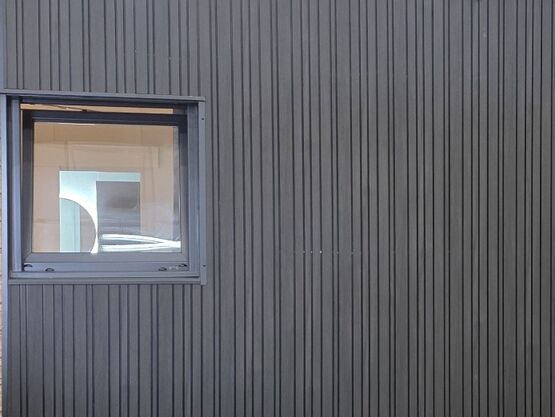 Une fois posé, on obtient une façade résolument moderne et le contraste recherché d’un bardage à claire-voie, lames. asymétriques. Ce bardage est entièrement sans plastifiants et sans substances toxiques de type biocides, sa matière première est issue du recyclage d'anciennes menuiseries.