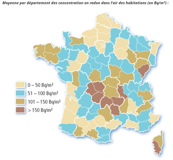 Le radon (Rn) est un gaz radioactif inodore, incolore et inerte. Il provient de la transformation du radium (Ra) issu de l’uranium (U) et du thorium (Th), éléments radioactifs présents dans les roches granitiques et volcaniques. Il émet des rayonnements ionisants alpha (α).