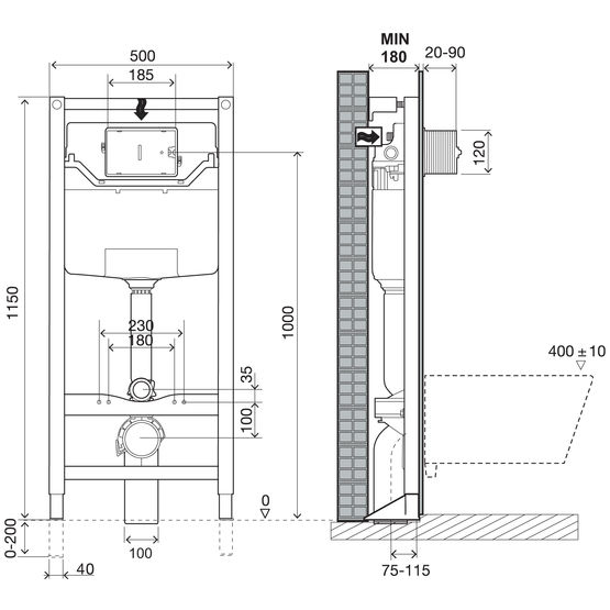 - S’adapte à toutes les cuvettes standards ou P.M.R et rallongée avec un entraxe de fixation de 180 ou 230 mm et d’une hauteur jusqu’à 50cm du sol fini