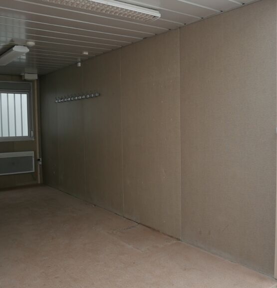 Cette préfabrication est composée de deux cadres de 6,04 x 2,44 m avec une hauteur sous plafond de 2,30 m en acier galvanisé laqué blanc, et des panneaux muraux isolés en mousse de polyuréthane de 40 mm d'épaisseur.