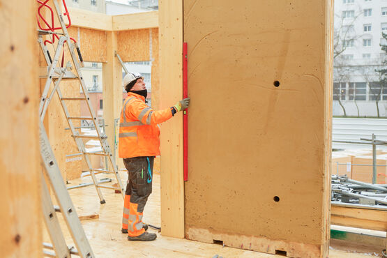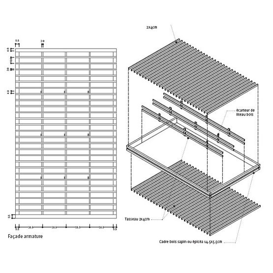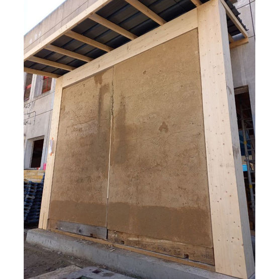 Possibilité de fabrication de panneaux en terre crue à ossature bois. La préfabrication permet d’intégrer le temps de séchage en usine et de livrer un élément fini sur chantier avec des temps de pose réduits.