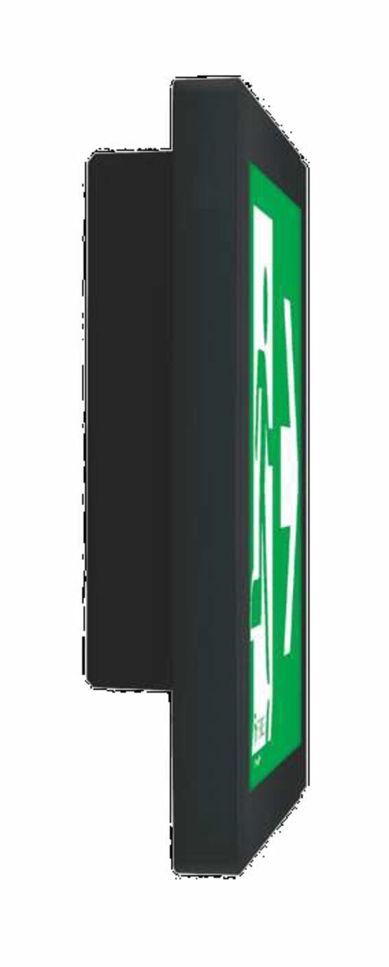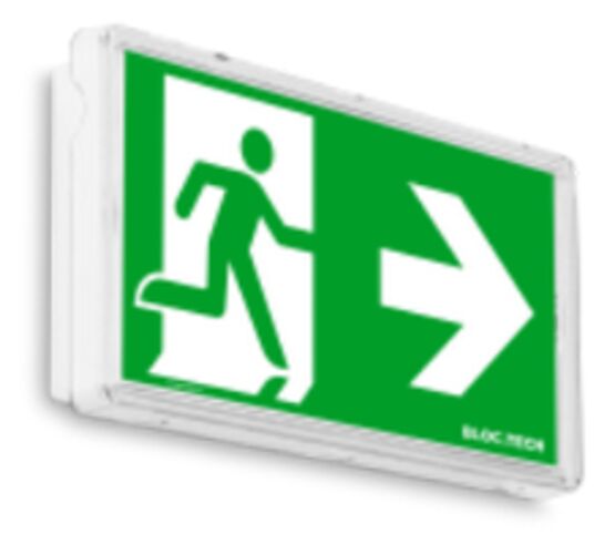 Le bloc de secours BT-BAES-E1S est fabriqué en polycarbonate (IP 44/IK 08) avec fond translucide et comporte un pictogramme standard inclus, sous forme d’un bonhomme en vert et une flèche en blanc.