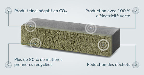 Ce procédé crée une brique dure comme du calcaire. Une liaison permanente avec les matériaux contenant de l'oxyde de calcium permet d'économiser jusqu'à 60 kg de CO2 par tonne de matériau.