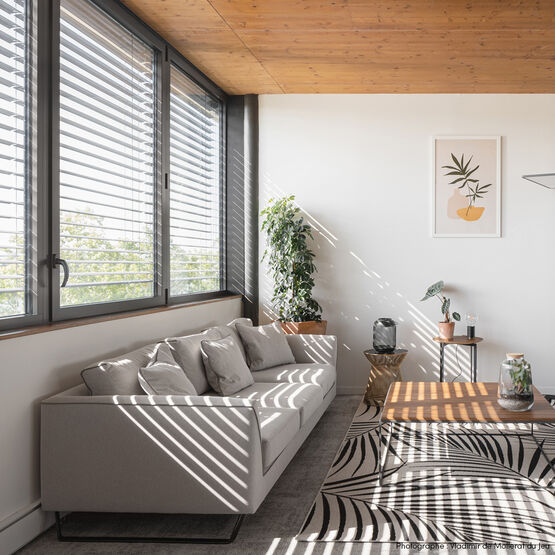 Solomatic, le brise-soleil orientable historique de Griesser, conjugue un design intemporel avec une technologie de pointe. Ses lames bombées et ourlées contribuent à une gestion optimale de la lumière, tandis que le cordon échelle en Kevlar confère une grande longévité à la fermeture des lamelles. Décliné en deux largeurs, 80 ou 70 mm, il s'adapte à divers espaces.