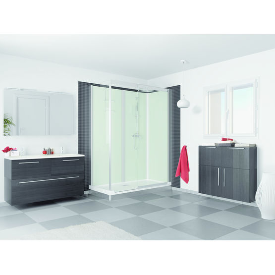Cabine de douche dédiée au remplacement d’une baignoire existante. Proposée en modèle à poser en niche ou en angle de 120 à 204 cm de largeur (hors tout) et 69,5 à 91,5 cm de profondeur. Receveur en matériau de synthèse (Biotec) de 3 cm d’épaisseur avec grille d’évacuation en acier inoxydable poli. Décliné en 3 versions avec (selon modèles) paroi en verre trempé de 8 mm d’épaisseur, transparent avec ou sans bande centrale horizontale dépolie, panneau de fond en verre blanc opaque, avec ou sans porte coulissante, mitigeur mécanique ou thermostatique, douchette à main, douche de tête, barres de maintien, etc.