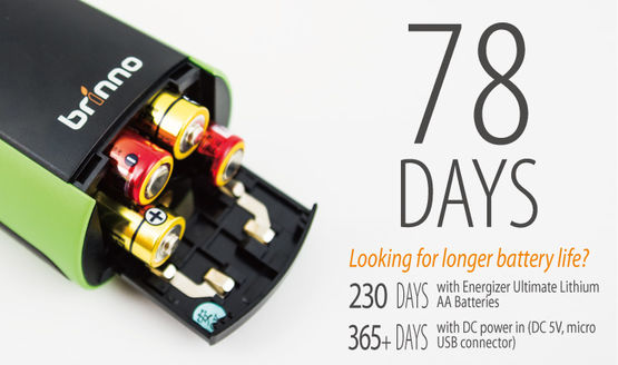 La caméra de chantier Brinno est alimentée par 4 piles de type AA, d'une durée de vie de 78 jours, en mode intervalle, à raison d'une photo toutes les 5 minutes.