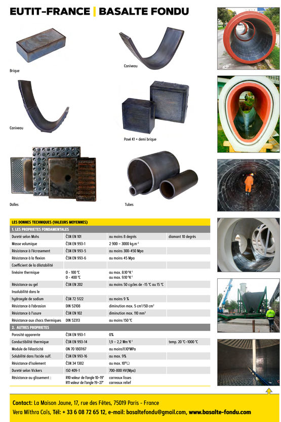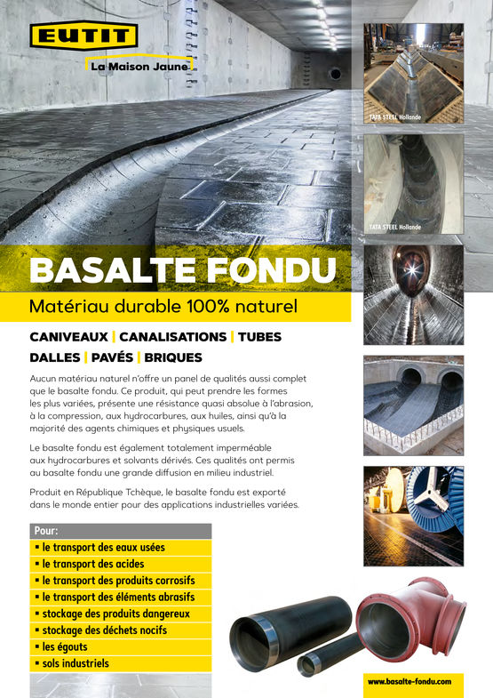 Utilisé pour la construction et la réhabilitation des canalisations, le basalte fondu protège la vie des installations grâce aux caractéristiques techniques de ce matériau 100% naturel : porosité zéro, résistance à l’abrasion, à la corrosion et aux produits chimiques (acides, solvants, …)
