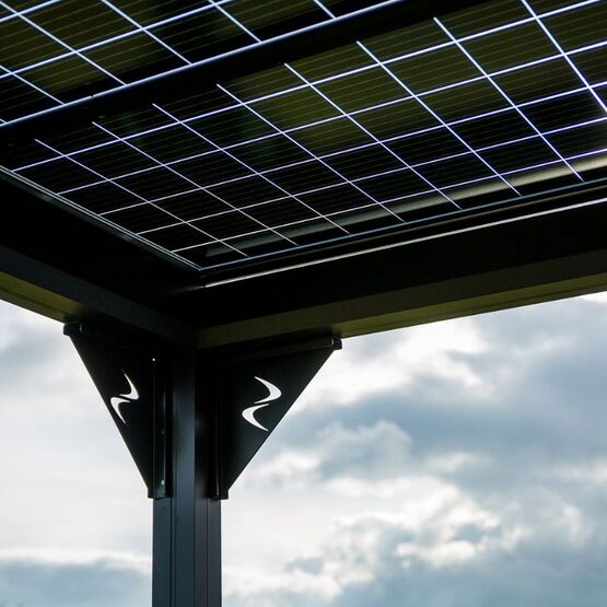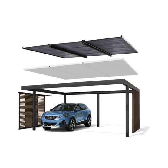 Doté d'une structure en aluminium moderne et de panneaux photovoltaïques bi-verre, cet abri innovant s'adresse aux maisons ou bâtiments à énergie positive, tout en permettant d'abriter une ou plusieurs voitures.