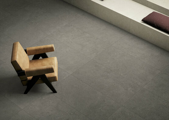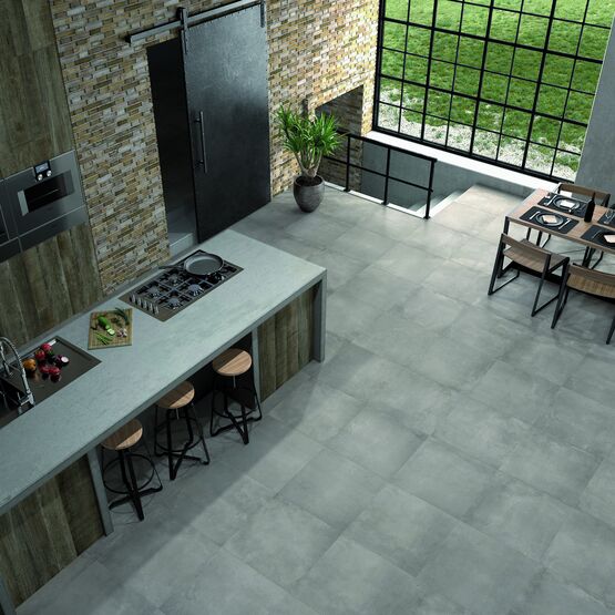 1. Esthétique béton authentique : Les nuances et irrégularités réalistes du carrelage Belcanto apportent une touche industrielle tendance et chaleureuse.