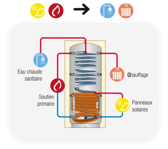 - Ballon de 300 à 800 litres avec échangeur à serpentin pour la production d'ECS semi-instantanée