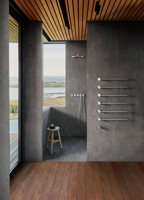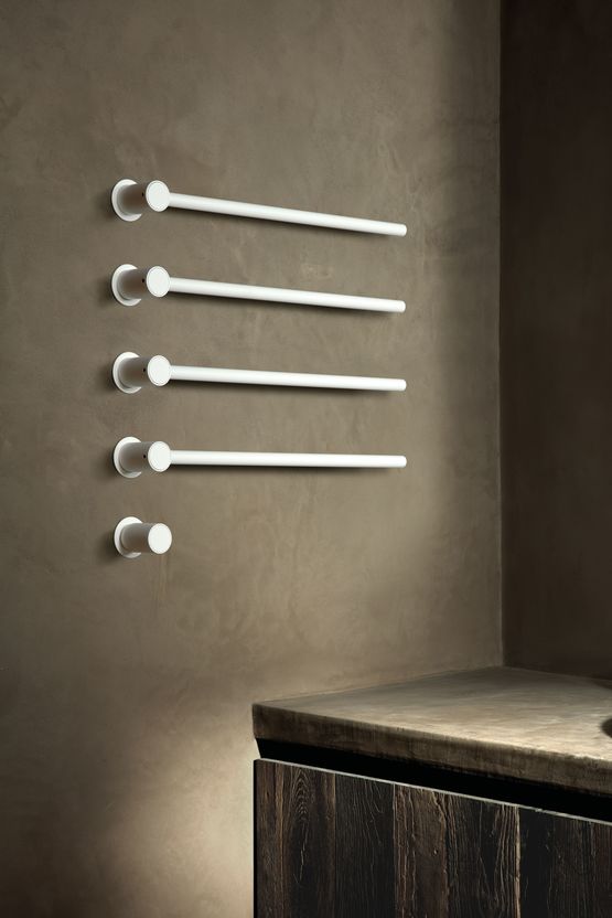 Le chauffe-serviettes électrique encastré mural de la collection Vola est un nouveau système modulaire doté d’un design moderne servant à étaler des serviettes humides en vu de les sécher rapidement.