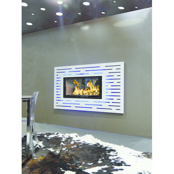 Façade de cheminée ajourée en marbre blanc de 169,5 cm de longueur, 100 cm de hauteur et 2 cm d’épaisseur. Intègre, en face arrière, un éclairage à leds multicolore piloté par une télécommande. Proposée avec insert de 7 kW de puissance (VE1000) à foyer en brique réfractaire et acier ou vermiculite. Équipé deux commandes indépendantes pour le réglage de l’air primaire et secondaire. Porte vitrée droite sérigraphiée.