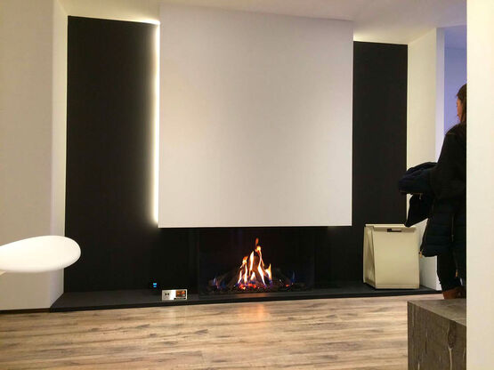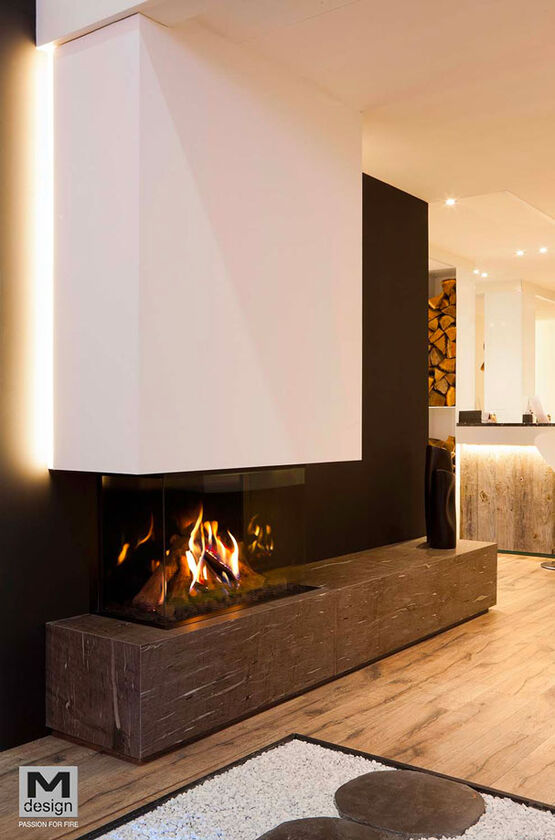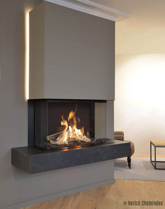 Cheminée gaz à double coin avec bûches en céramique et fond du foyer en acier ou miroir noir ou fonte | True Vision 850 DC
