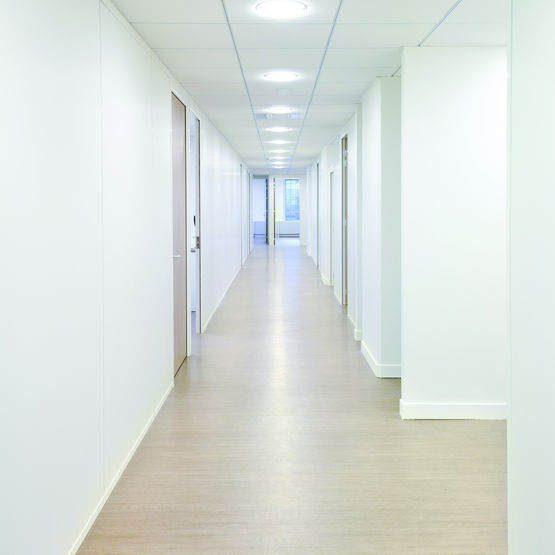 Cette cloison pleine à couvre-joint résiste au feu jusqu'à 1 h. Structure composée de 4 panneaux, d'une ossature intérieure en acier, d'une ossature visible en aluminium laqué et d'un isolant en laine de roche de 40 mm d'épaisseur. Possibilité d'une huisserie en acier laqué et d'une porte bois ou métallique. Remplissage par une 1ère peau en plaque de plâtre et une 2ème peau en plaque de plâtre, plaque fermacell, panneau mélaminé, panneau aggloméré bois ou stratifié compact.