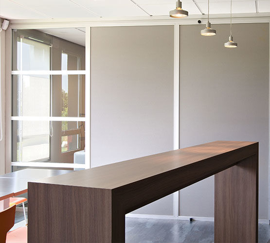 Prêt à poser, composée de portes sans parclose apparentes, de cloisons bords à bords et de châssis fixes, elle améliore l'acoustique. Proposée en finition brute, vernie ou laquée et différentes essences possibles.