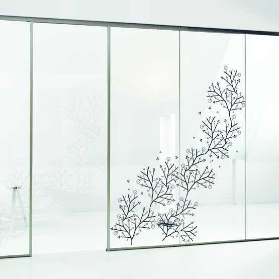 Cloisons de bureaux de 50 mm d'épaisseur composées de panneaux vitrés sans montant et de portes pleines ou vitrées. Cloisons simple ou double vitrage de 10 ou 12 mm d'épaisseur. Vitrage maintenu au sol et au plafond par des lisses en aluminium extrudé anodisé ou laqué composées d'un profilé fixé au support et d'une pareclose. Jointoiement des vitres par montant invisible ou joint EPDM. Portes coulissantes (simple vitrage) ou sur charnières ou pivots (simple et double vitrage). Battants de portes disponibles en quatre versions : stratifié ou plaqué de bois vernis, vitrés simple ou double.