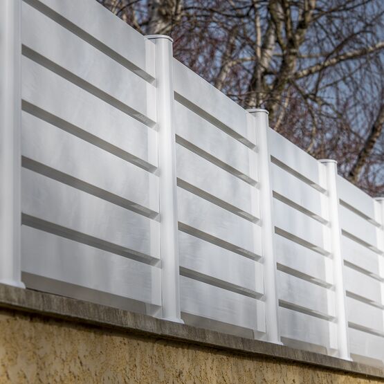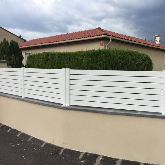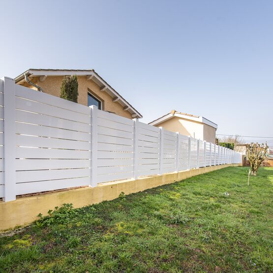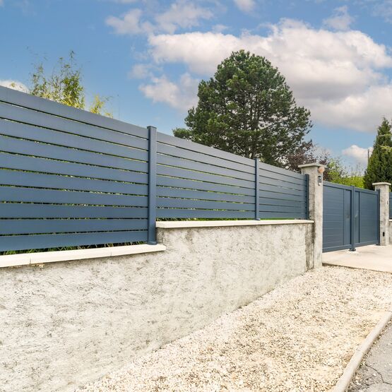 La légèreté graphique de ses lames horizontales ajourées de 90 mm et sa solidité en font une clôture aluminium durable et une solution idéale pour les zones venteuses. Elle est également conforme aux réglementations d’urbanisme (PLU) exigeant des clôtures non pleines.