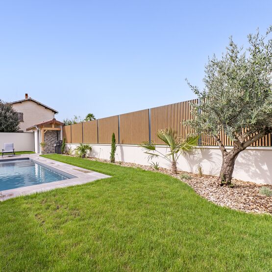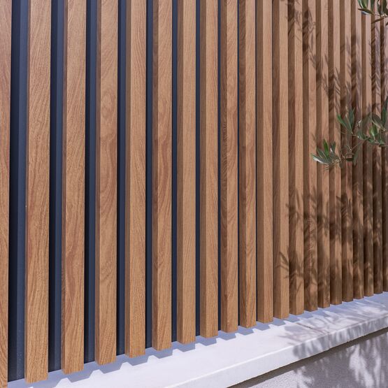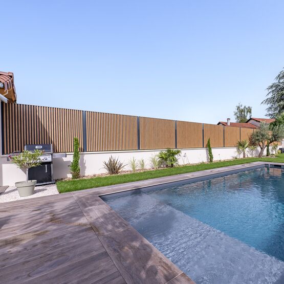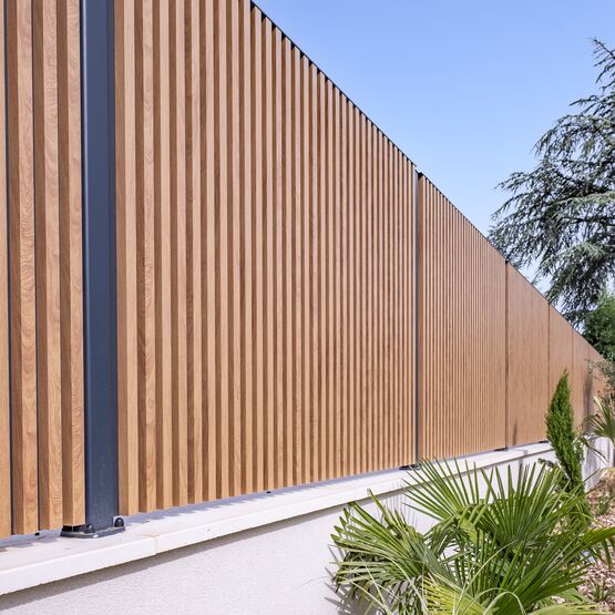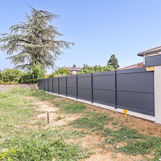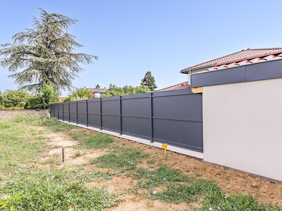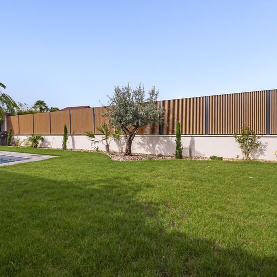 Vous pourrez intégrer son portail aluminium assorti pour créer une unité parfaitement harmonieuse pour l’entrée de votre maison individuelle. Grâce à sa tôle d’occultation, cette clôture assure une intimité complète et se marie parfaitement avec l’aluminium ton bois.