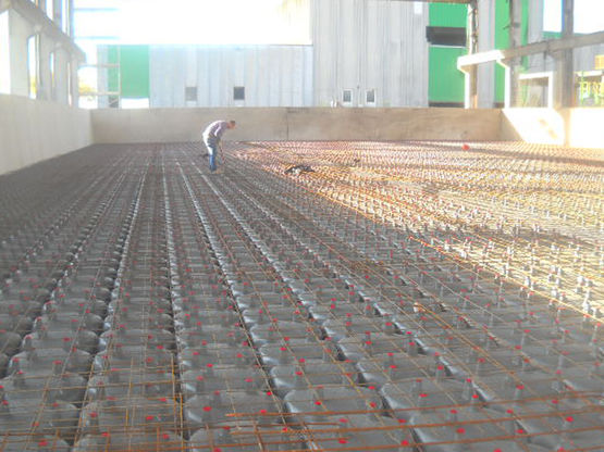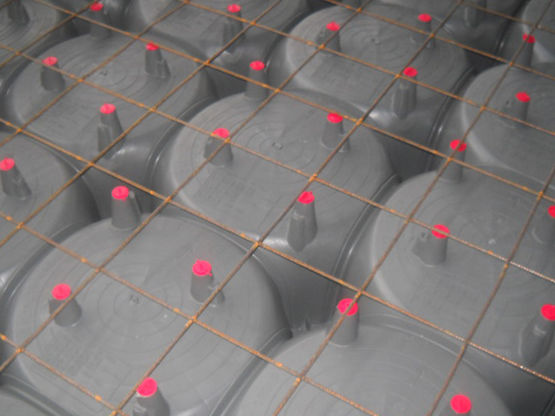 | Mise en oeuvre : | pose à sec ; renforts métalliques liaisonnés au treillis soudés ; surcharge épaisseur plancher béton coulé de 6 cm ; retrait des bouchons après consolidation de la coulée de béton. |