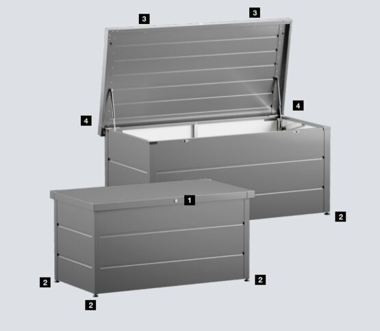 Résistants aux UV et aux intempéries et étanches à l’eau de pluie, ces mobiliers de jardin sont équipés de serrures à cylindre intégrées discrètement dans le couvercle.