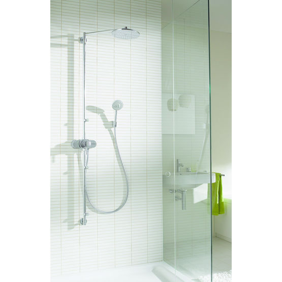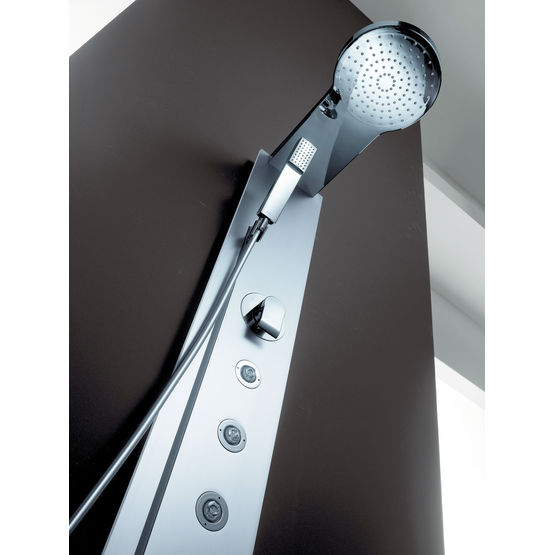 D'une construction robuste, la colonne de douche AQUASTYLE comprend un mitigeur thermostatique encastré (+ flexibles d'alimentation), une douchette à main en laiton avec flexible anti-torsion et une large douche pluie avec picots silicone anticalcaires.