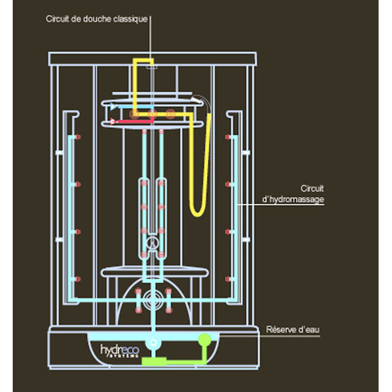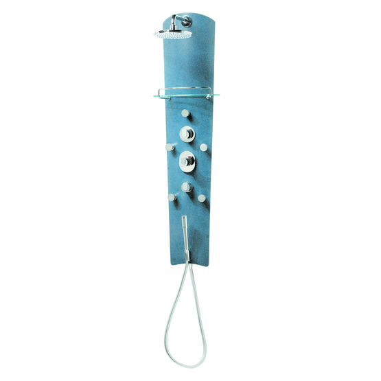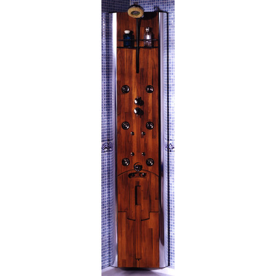 Colonne de douche en teck massif de 28 mm d'épaisseur avec cadre en aluminium brillant. Douchette à main avec flexible en laiton chromé et éponges amovibles. Six buses chromées orientables à massage pulsant avec système anticalcaire et six buses dorsales fixes. Mitigeur thermostatique encastré à sécurité antibrûlure. Deux tablettes porte-flacons en verre avec garde-fous chromés. Siège rabattable en teck massif.