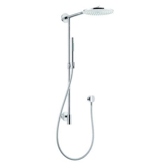 Cette colonne de douche métallique aux lignes rétro retranscrit l’esprit des salles de bain d’époque. Elle dispose d’un robinet thermostatique avec manette de commande oblongue blanche et bouton de réglage de la température à croisillon. Sa douche de tête de 20,3 cm de diamètre intègre des buses autonettoyantes. La douchette sur flexible est montée sur curseur avec système de verrouillage par bouton également à croisillon. Coordonnée avec les autres modèles de la gamme.