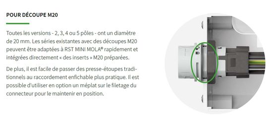 4. Compatibilité et universalité : Le connecteur est conforme aux découpes M20 et remplace aisément les borniers de raccordement internes, améliorant la flexibilité et la polyvalence des installations.