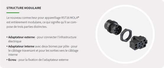 1. Flexibilité d'installation accrue : Grâce à sa conception modulaire, le connecteur MOLA® s'adapte à un large éventail d'applications, y compris l'éclairage, les moteurs, et la climatisation.