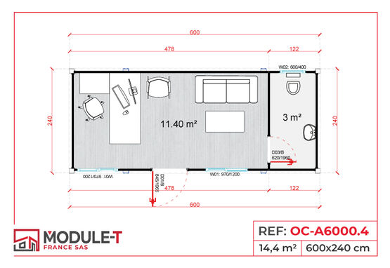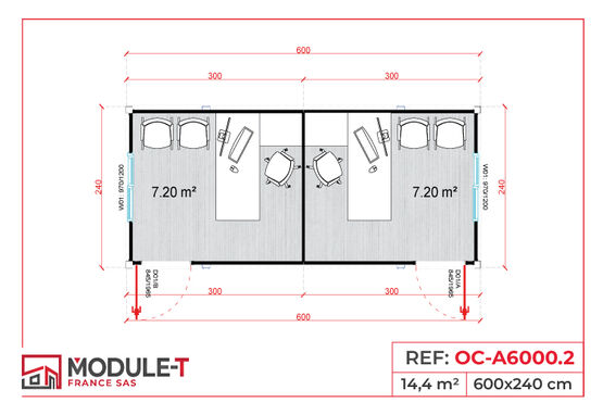 Livrés en kit et démontables, les bungalows bureaux de chantier de Module T sont proposés en dimension standard de 6×2,5 m avec une hauteur extérieure de 2,6 m.