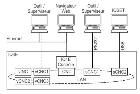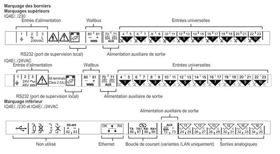 Le contrôleur IQ4E comporte 16 canaux d’entrée/sortie répartis en 10 entrées et 6 sorties, avec la possibilité d’extension jusqu’à 192 canaux pris en charge par le bus E/S selon la variante du contrôleur.