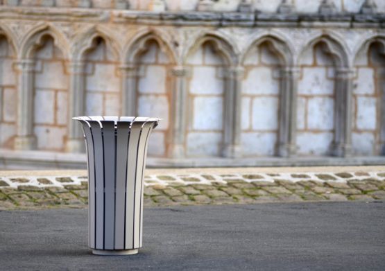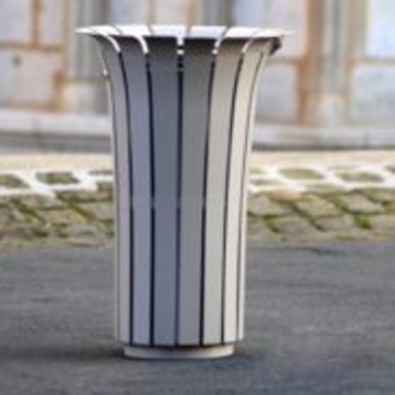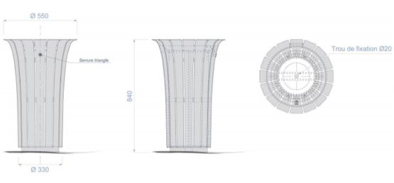La corbeille Orchidée est d’une hauteur de 840 mm, d’un diamètre haut de 550 mm, d’un diamètre bas de 330 mm et d’un diamètre socle de 280 mm. Elle est peut-être personnalisée avec une découpe laser.