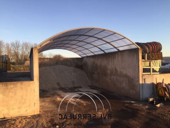 Chaque voûte est recouverte de plaque en polycarbonate alvéolaire transparent, traitées contre les rayons UV, maintenues par des capots en aluminium laqués ainsi que des feuillards inox, ce qui permet aux plaques de résister aux vents forts.