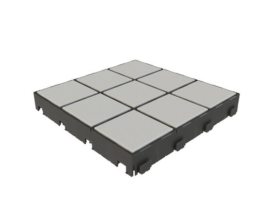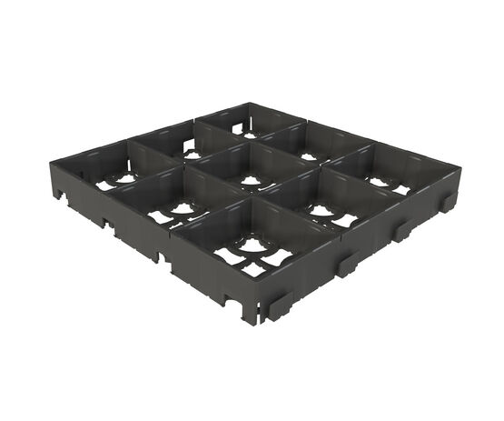 La dalle PAV65 est une dalle en matériaux 100% recyclés et 100% recyclables conçue pour accueillir 9 pavés carrossables de dimensions 150x150x60mm.